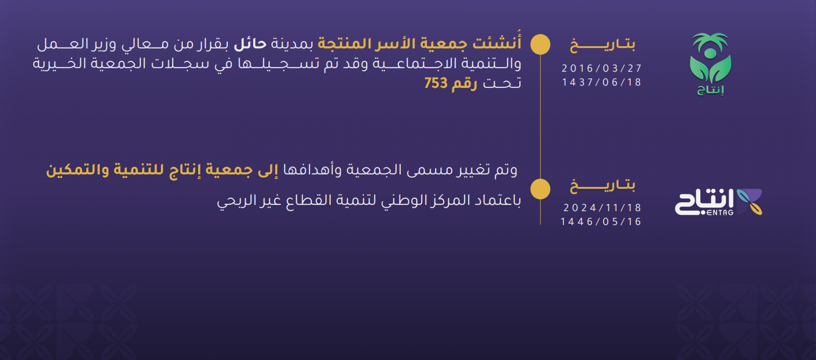 تأسست جمعية إنتاج للتنمية و التمكين بمنطقة حائل بقرار معالي وزير العمل والتنمية الاجتماعية رقم ( 76610 ) بتاريخ 18/6/1437 هـ، وقد تم تسجيلها في سجلات الجمعيات الخيرية تحت رقم (753)، وفقاً للائحة الجمعيات والمؤسسات الخيرية العاملة في المملكة